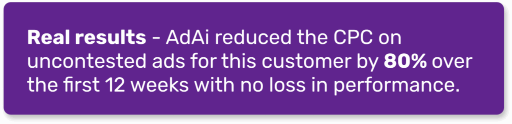 AdAi’s patented system uses AI agents to maximize your ad spend efficiency by identifying when your ads are running uncontested and dynamically reducing the Cost-Per-Click (CPC) to the lowest possible price in real-time. This ensures you capture every valuable click without overpaying, turning what was once wasted budget into an opportunity for growth and reinvestment.