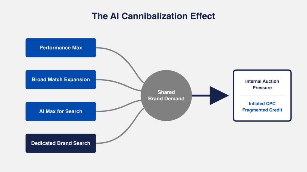 Google’s AI products don’t coordinate, they compete. Performance Max, Broad Match, and AI Max for Search campaigns all chase the same high-converting brand queries, creating internal auction pressure that raises costs per click (CPCs) and distorts performance.