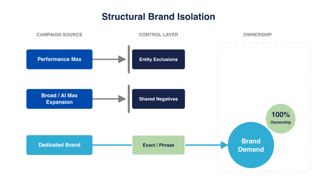 Eliminating brand cannibalization requires assigning a single campaign full ownership of brand and enforcing that ownership across the account by coordinating controls (negatives, PMax exclusions, and match types) to prevent other campaigns from entering the same auctions. Without that system, brand remains a shared resource and internal competition persists.