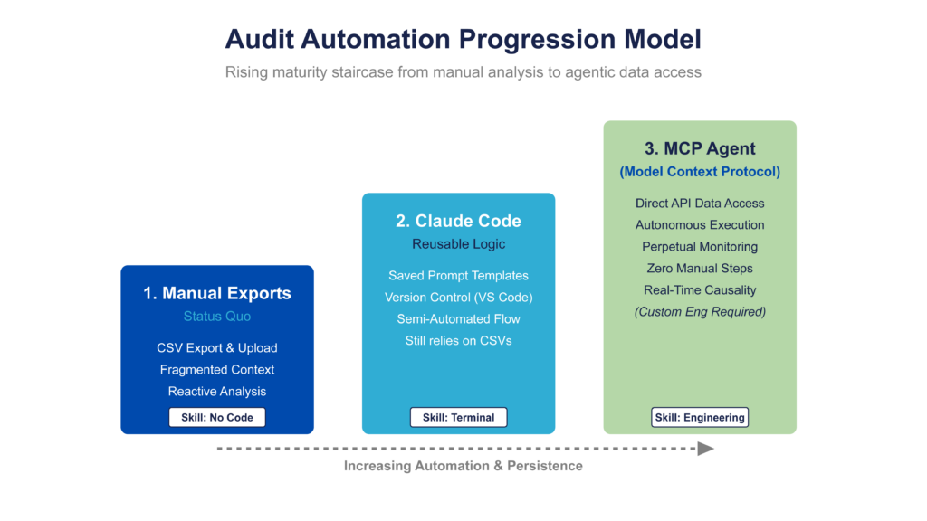 Claude turns one-time audits into repeatable systems by removing the need to rebuild analysis and re-export data each time. With saved workflows (Claude Code) and direct data access (Model Context Protocol), the same audit logic can be reused and run continuously instead of starting from scratch.