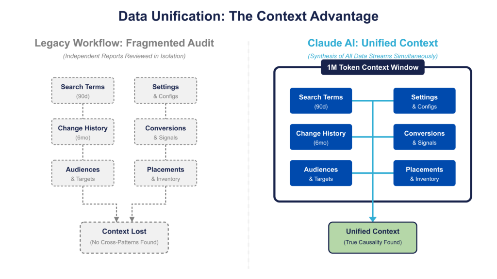 Claude’s advantage is its ability to analyze full, disconnected Google Ads datasets together, eliminating fragmentation and surfacing cross-dimensional patterns that isolated reports miss. Its large context window allows search terms, settings, and change history to be evaluated in a single pass, preserving relationships that break in chunked workflows.