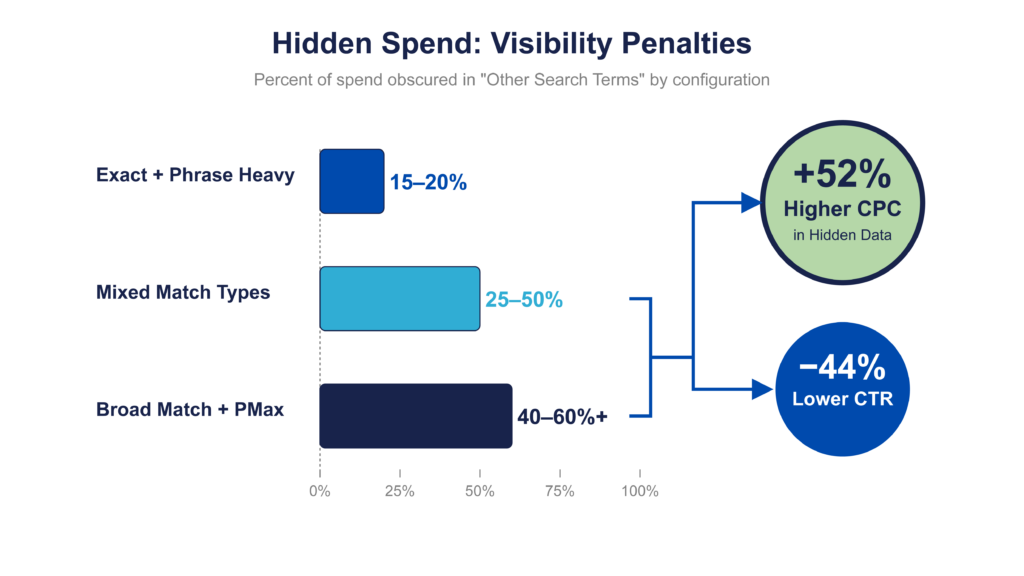 Since 2020, Google has hidden a significant share of queries, routinely pushing 25–50% or more of spend into “Other search terms.” Some accounts see over 70% hidden. Independent analysis of $20M+ in Google Ads spend found that hidden terms drove 52% higher CPCs and 44% lower click-through rates compared to visible queries. The problem is worse in accounts running heavy Broad Match with Performance Max. If you’re auditing an account that’s mostly Exact and Phrase match, you might see 15–20% hidden. All Broad with PMax? Expect 40–60%+. The match type mix determines how much of your data you’re actually analyzing.