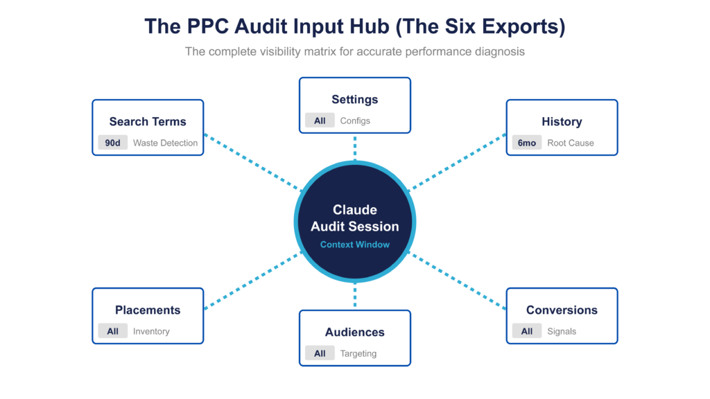 A complete Claude audit depends on six core exports: search terms, campaign settings, change history, conversion actions, audience segments, and placements. Together, these show how spend is generated, influenced, and measured. Missing or misconfigured data in any one of these creates blind spots that limit what Claude can accurately diagnose.